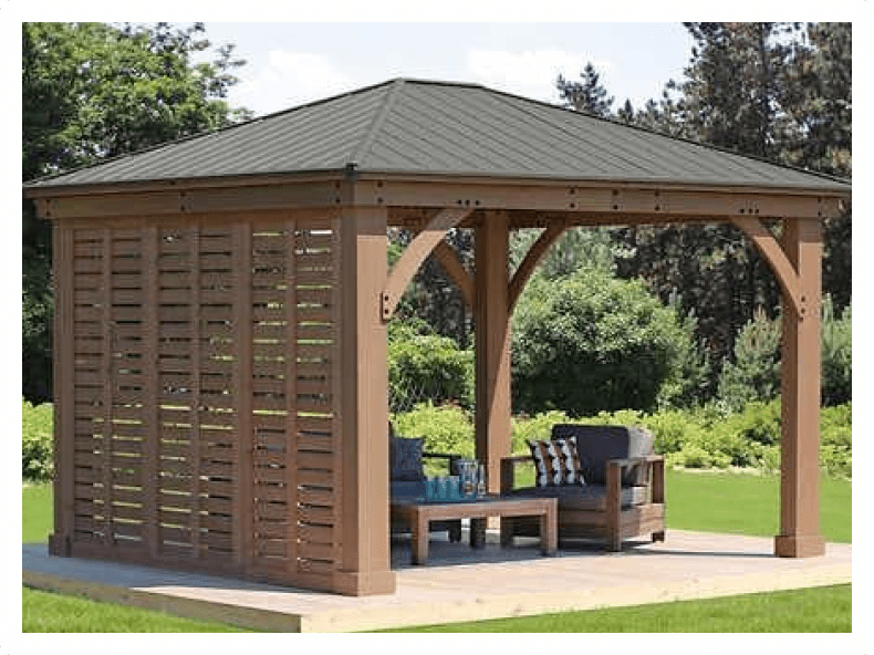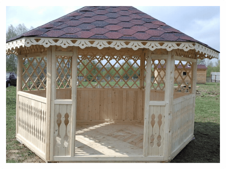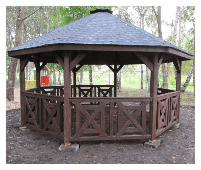 После установки обязательно покрасить беседку, так как в противном случае внешняя деревянная отделка может разбухнуть. Краску необходимо использовать с высокой паропропускной способностью.